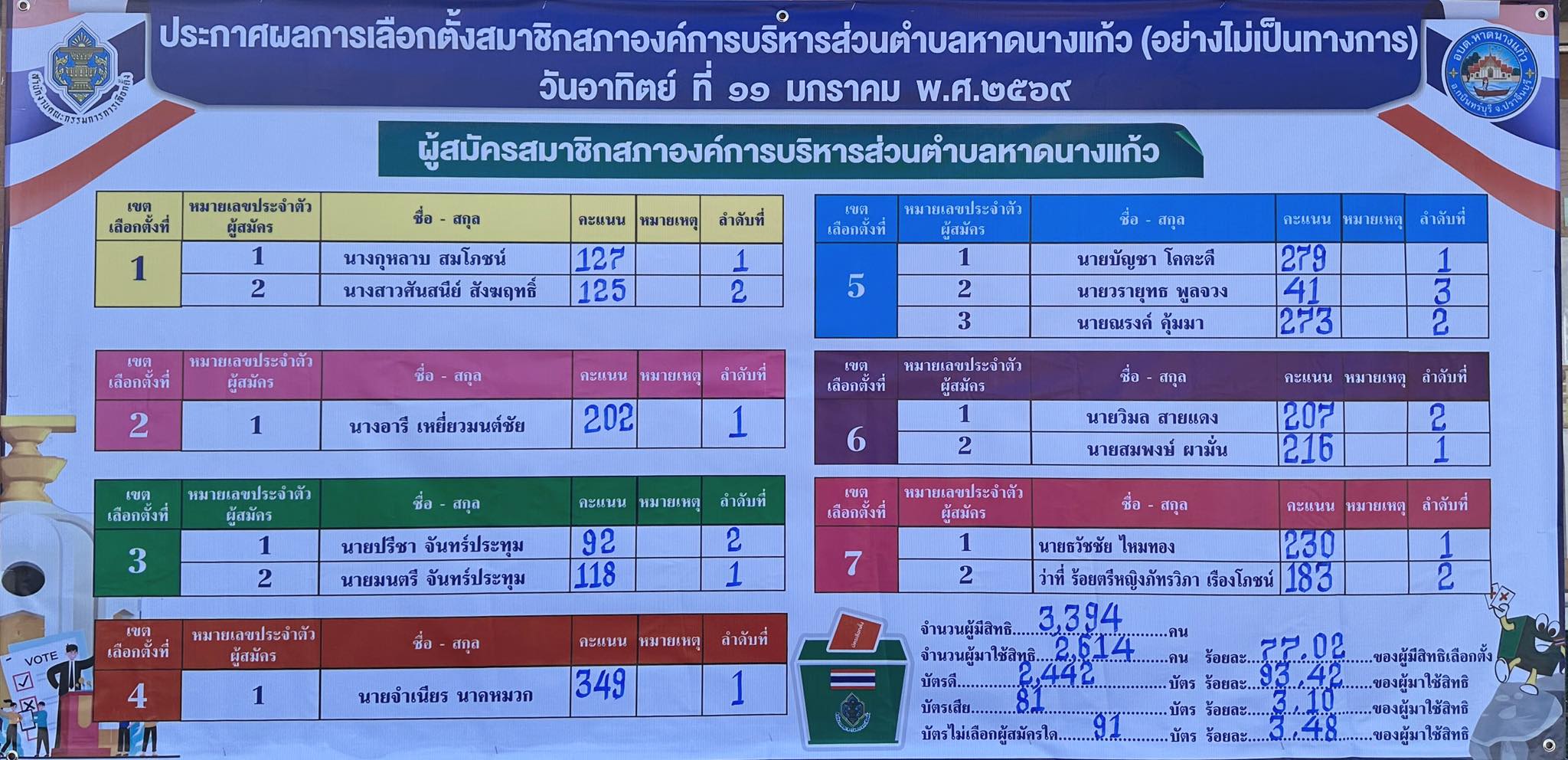 ประกาศผลการเลือกตั้งสมาชิกสภาองค์การบริหารส่วนตำบลหาดนางแก้ว(อย่างไม่เป็นทางการ) |