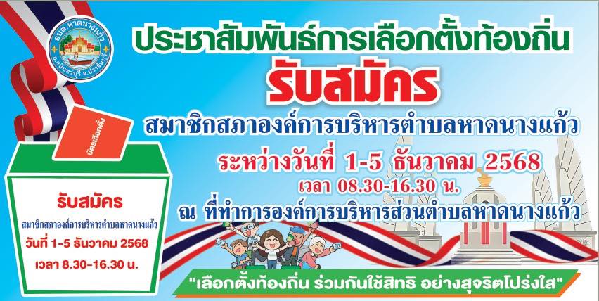 ประชาสัมพันธ์การเลือกตั้งสมาชิกสภาองค์การบริหารส่วนตำบลหาดนางแก้ว โดยกำหนดวันรับสมัคร1-5 ธันวาคม 2568 เวลา 8.30น.-16.30น. ณ.ที่ทำการองค์การบริหารส่วนตำบลหาดนางแก้ว